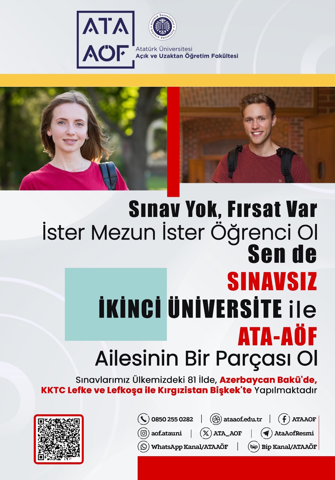 Atatürk Üniversitesi Açık ve Uzaktan Öğretim Fakültesi’nin Sınavsız İkinci Üniversite başvuruları 17 Ekim 2025 tarihine kadar devam etmektedir. Bu kapsamda tercih edilebilecek programlar, https://www.ataaof.edu.tr/ adresinde yer almaktadır. Sınavsız İkinci Üniversite tanıtımına yönelik afiş aşağıda yer almaktadır.